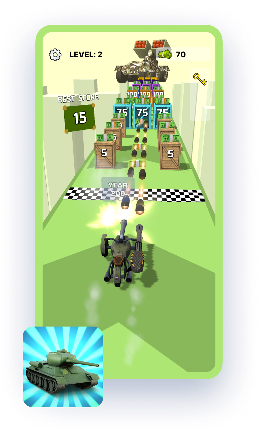 In this action-packed mobile game, you control a powerful armored vehicle, ranging from a cannon to modern tanks and planes, as it charges forward through enemy lines. Your objective is to shoot down enemy forces and hit special gates to collect upgrades while collecting money to upgrade your shooting abilities and equipment.